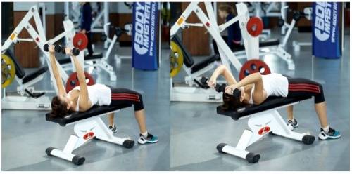 Техника выполнения: Необходимо поднять гантели вверх и расположить их чуть выше плеч и не стоит выводить руки слишком назад, выведите их наоборот немного вперед. Затем необходимо мощно свести гантели и медленно опускать их. Запомните, ваши мышцы растут не за счет поднятия гантели вверх, а именно при опускании гантели вниз, именно поэтому уделяйте больше внимания негативной фазе при выполнении упражнения.