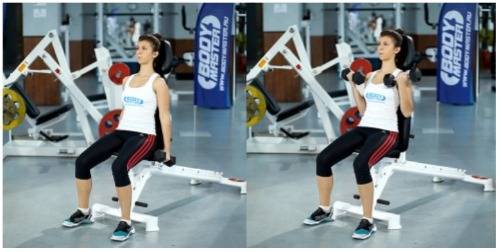 Вторым, и последним, упражнением сета станет подъем гантелей на бицепс сидя. Все тот же стул, те же гантели. Руки расслаблены. Выполняя подъем, то есть сгибание рук в локте, поворачивайте запястья ладоням к себе. В верхней точке задержитесь на секунду, стараясь напрячь бицепс. Повторите 3 подхода по 15 повторений.
